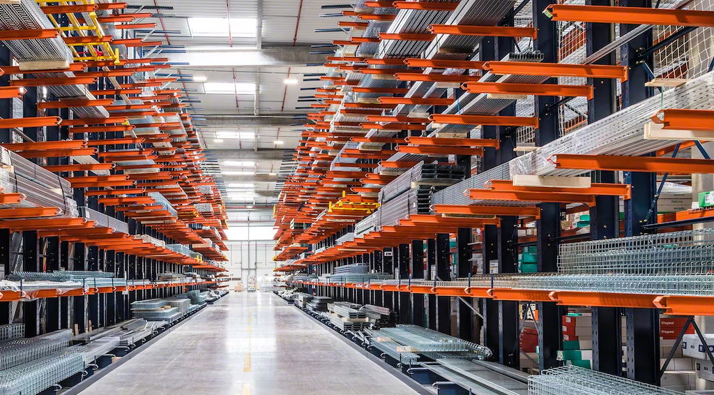 Esta estrutura é ideal para armazenagem de cargas longas e volumosas, como tubos, madeira e perfis metálicos. Sua característica é a ausência de colunas frontais, facilitando o acesso lateral e a manipulação de objetos com dimensões especiais.